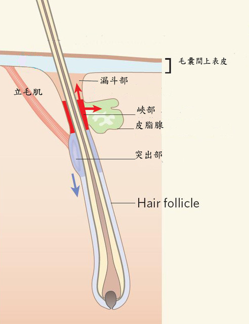 1. 毛囊的漏斗部(infundibulum),也就是從毛囊皮膚出口自皮脂腺導管路口